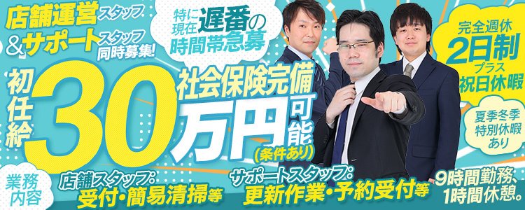 ・研修後初任給+各種手当で月給300,000円受給可能 ・頑張り・実力次第で入社1年でマネージャー職に就く事も可能(独自の短期昇格制度あり) ・東日本で20店舗以上、60年以上この業界を運営している大手法人営業なので、安心してお勤めいただきます。 ・クリーン経営で暴力団や違法スカウト業者等との関りは一切ありません。 ・個人に依存しない組織形態の為、ノルマや罰則なども一切ありません。 ・当店のスローガンが「真面目に風俗を仕事として取り組む事」なので「温厚」なスタッフが集まっています。(半グレ風スタッフなど一切居りません) |