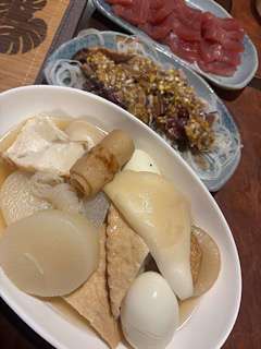 おでんとマグロのお刺身、かつおのたたきネギポン酢