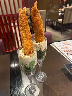 こんなエビフライ見たことない!!笑グラスに野菜とタルタルソースその中にエビフライ🍤