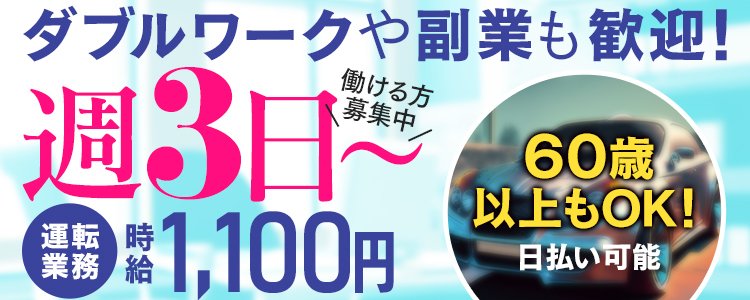 ------------------------------------------------- 〇給与は全額即日支給 〇仕事内容は単純業務のみ 〇経験問わず、未経験からでもOK 〇快適な職場環境で働きやすさも抜群! 〇土地勘なくてもOK 〇即日勤務も可能! 〇長い時間でがっつり稼ぎたい方も大歓迎 ------------------------------------------------- 【お仕事Q&A】 Q.ドライバーの仕事内容は? A.女の子の送迎、客先への案内・お迎え等、まさにタクシー運転手のようなお仕事です! Q.フロントスタッフの仕事内容は? A、ドライバー・電話受付・ネット更新・清掃・顧客データの打ち込み等、どれも簡単なお仕事です! Q.初めての業界なので不安です A、しっかりと研修を行いますので不安がなくなるまで指導します。 Q.どんな人が働いていますか? A、専業の人もいれば、Wワークで頑張ってくれている人もいますし様々です。 Q.どのくらい出勤するべきですか? A、ご自身の目標とする金額に合わせて出勤してくれればOKです。 Q.ホテルに詳しくないのですが… A、大丈夫です。フロントスタッフをするとしても、まずはドライバー業から始めていただきます。ホテルリストもあるので問題ありません。まずは走って場所を覚えて、その後電話受付へと段階的にお仕事を振っていきますのでご安心ください。 Q.お給料はどのようにして 支払われますか? A、もちろん、その日に働いた分は、全額その日に現金でお支払いいたします。 そのほか気になる事があれば、メールやLINEからお気軽にお問い合わせください。 |