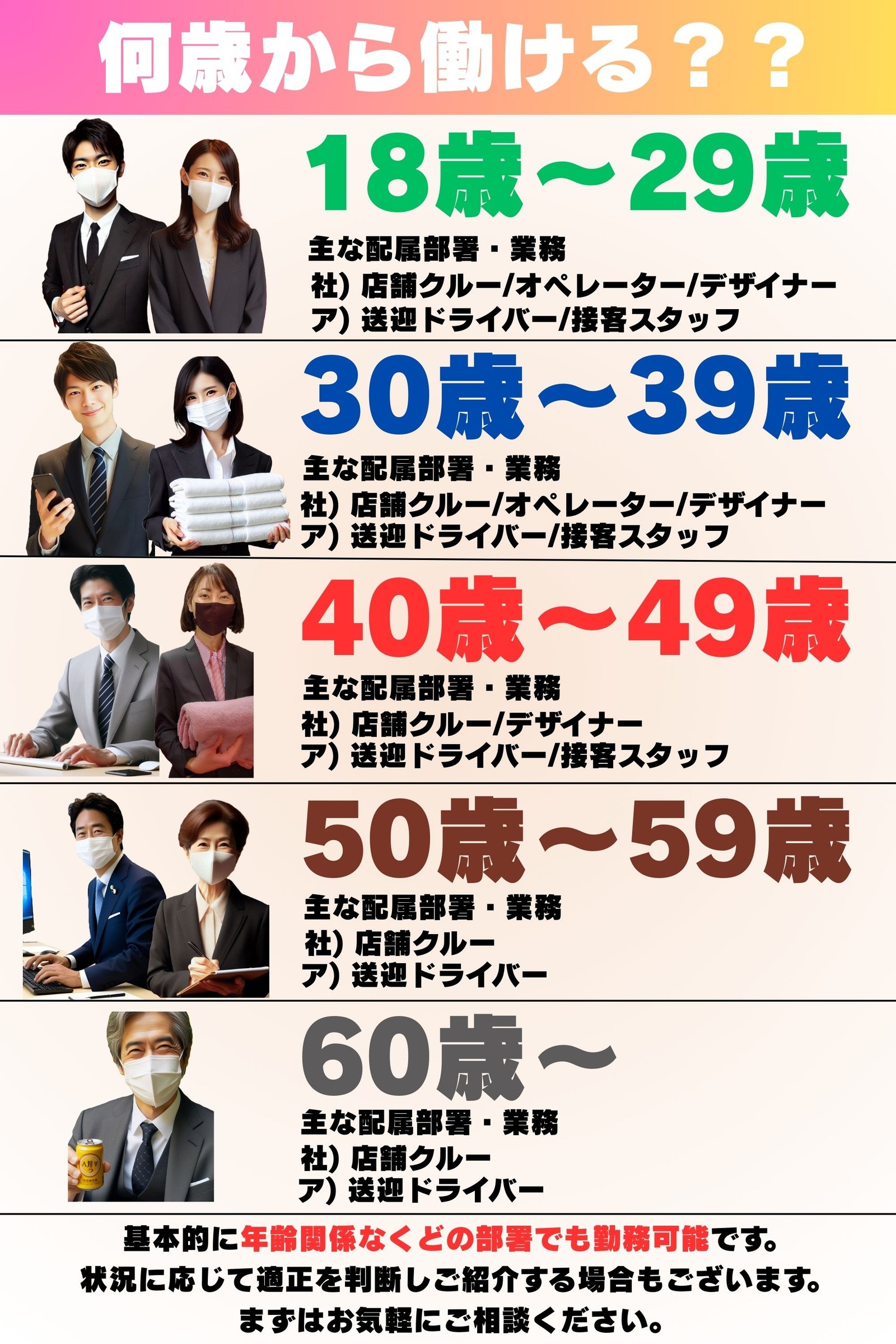 実際、60代のアルバイトの方とか40代の新入社員とか、女性スタッフとかいろいろいますので、自分に蓋をせずお気軽にご応募ください。そのうえで適切に判断させていただきます✨