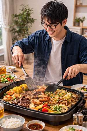家で簡単ですが、ホットプレートを使い料理をしてます。