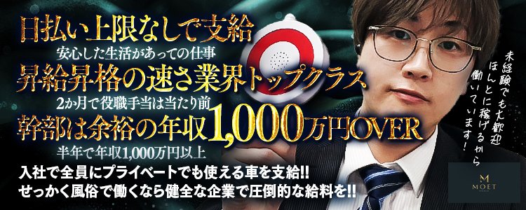 ☆うれしい特典1☆ ↓↓↓↓↓ 入社祝金50万円支給!! ※必ず貰えます。 ☆うれしい特典2☆ ↓↓↓↓↓ 社用車支給!! プリウス支給&任意保険も会社が負担!! ☆うれしい特典3☆ ↓↓↓↓↓ 社員寮完備 即入居可能!! ◆今、転職を考えているアナタへ コンビニ配送業、介護士、パチンコ店スタッフ、ホテルマン…等々。 現在、当グループに所属しているスタッフの7割は異業種からの転職組がほとんどです! 全員、以前の職場より【高い給料】と【より良い待遇】を求めて当グループの門戸を叩き、実際に前職以上の給与と待遇を得ることに成功しています!! もちろん給与面だけではありません!ライフワークバランスでプライベートの充実がもたらす仕事へのモチベーションを考慮し 休暇や勤務時間などプライベートの時間を確保できるように努めております!その結果既婚者の割合も増加しておりますよ!! クラブモエ グループには、あなたの求めているモノが必ずあります!! あなたが活躍できるステージを必ず用意できます!! 私達と一緒に、もっともっとクラブモエ グループを盛り上げていきましょう! スタッフ一同、心よりご応募をお待ちしております!!!! |