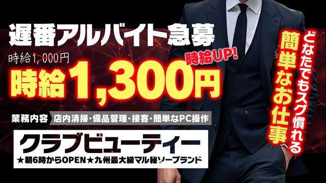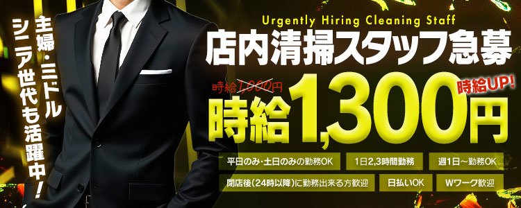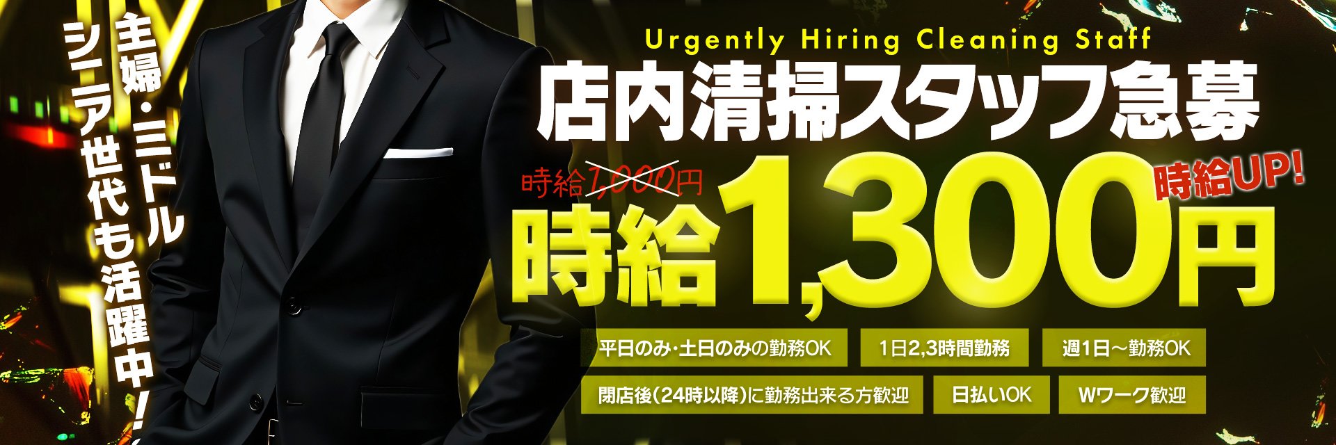 【時給1,300円】店内清掃スタッフ急募!ヤル気と真面目さがあれば即高収入のチャンス!どこよりも驚くほど速い昇給、昇格を体験してみませんか?中洲エリア新規オープンにつきスタッフ大募集中です