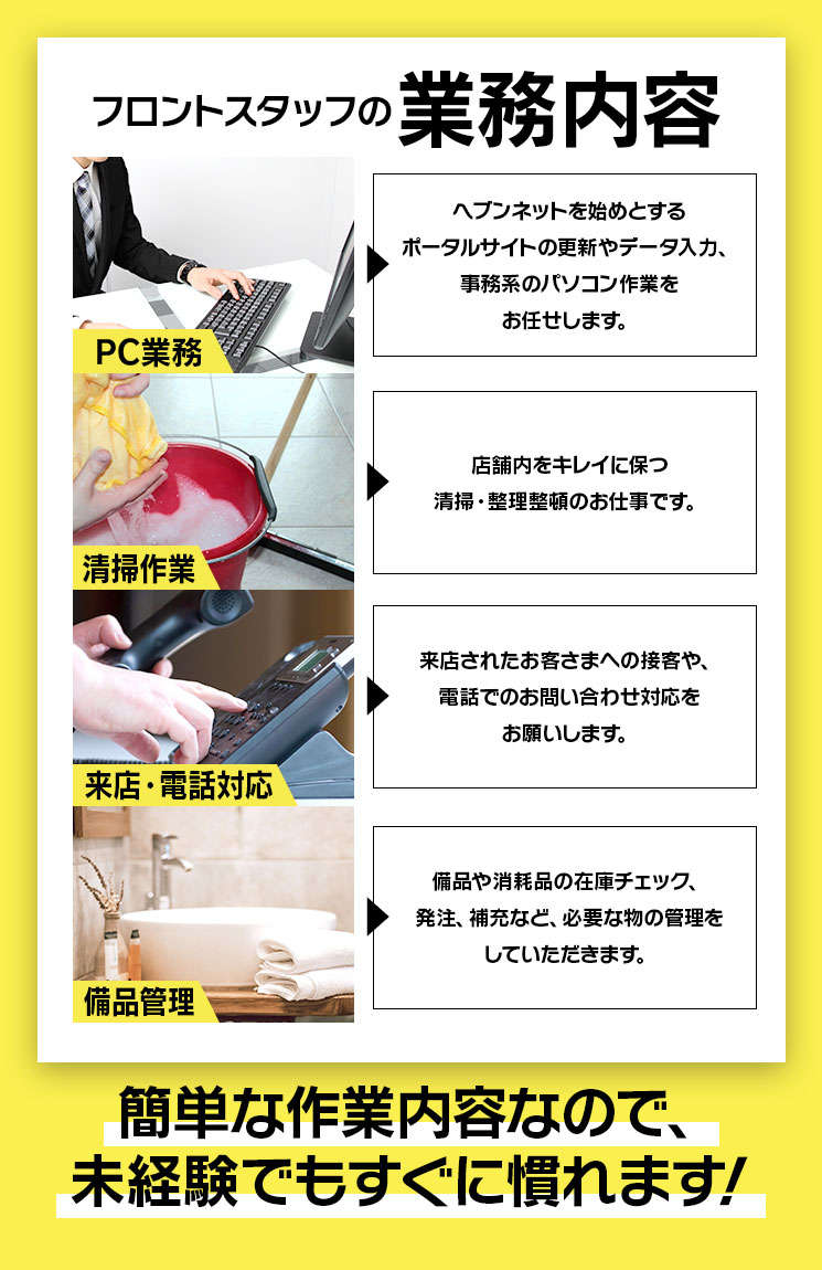 どんなお仕事? ソープランドの内勤スタッフを募集中です!難しいスキルは一切不要。未経験の方でもす...