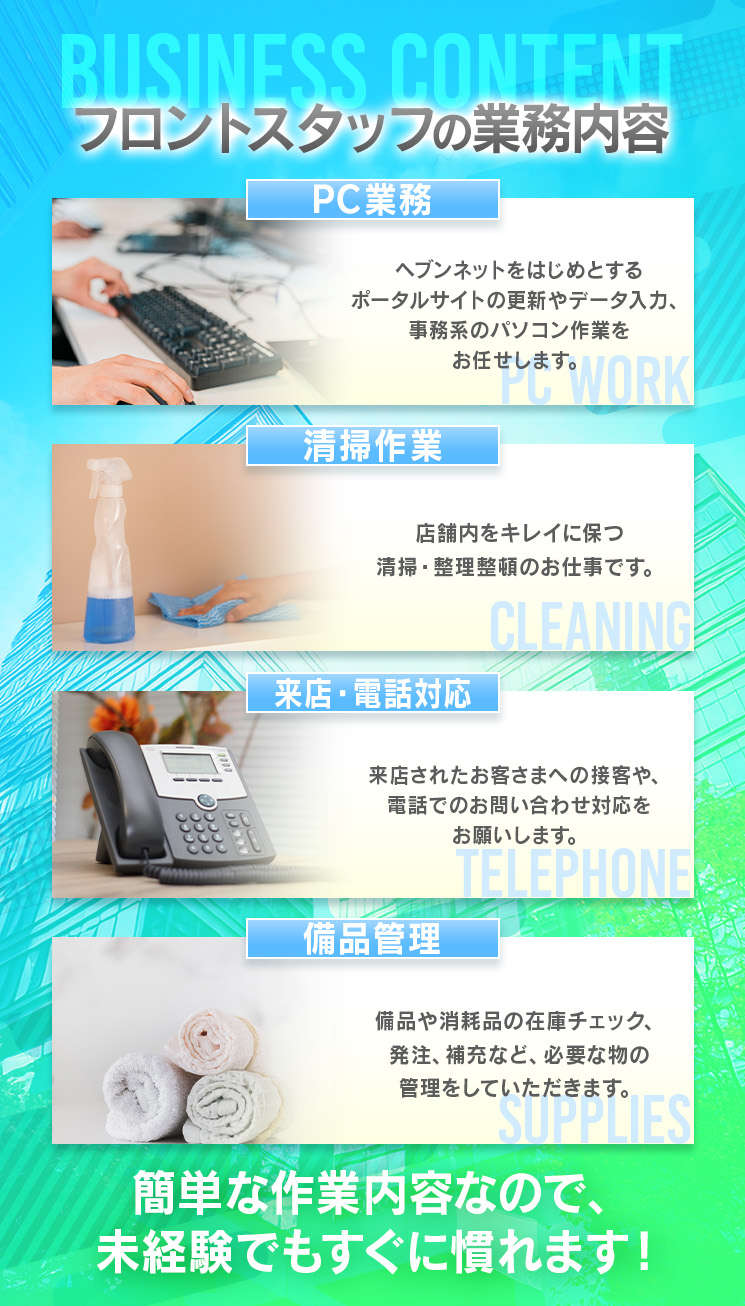 どんなお仕事? ソープランドの内勤スタッフを募集中です!難しいスキルは一切不要。未経験の方でもす...