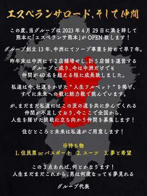 はじめまして!堀松と申します。以前は違うグループにいましたが、半年前にエスペランサグループにきました。最初は福岡の系列店で研修及び勉強をさせていただき、三か月前にエスペランサ熊本に配属。まわりのみんなのおかげで今では店長をさせていただいております。夢のある風俗業界であなたも一緒に稼ぎませんか?年齢や環境それぞれ色々とありますが、どんな状況であれ、自分がどうしたいのか、どうなりたいのか、あとはやるかやらないかだけです。この職業ですから稼がないと意味がないと思います。でもどうせやるなら明るく楽しく朗らかに!笑顔で稼げるエスペランサ熊本を目指して、一緒に夢を叶えましょう!ご応募お待ちしております。