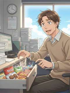 事務所の引き出しに隠しておいた秘密のお菓子たち、今頃僕の出番を待ってるんだろうな〜。