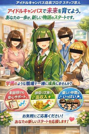 こんにちは。 アイドルキャンパス店長です。 お仕事を探している皆さんへ、少しだけお話させてください。 今、「新しい環境で頑張りたい」「もっと自分らしく働きたい」そんな気持ちを持っていませんか? アイドルキャンパスは、ただ働く場所ではなく、**仲間と一緒に成長していける“学園のような職場”**です。 初めてのお仕事で不安な方も、経験があってさらにステップアップしたい方も、私たちがしっかりサポートします。 最初は誰でも不安なもの。 ですが安心してください。 スタッフ同士の距離も近く、困った時には自然と手を差し伸べてくれる仲間がいます。 一人ひとりの個性を大切にしながら、一緒に成長していく環境がここにはあります。 働き方も柔軟で、頑張り次第でしっかり評価されるのも魅力のひとつ。 「もっと稼ぎたい」「自分の可能性を試したい」そんな前向きな気持ちを、私たちは全力で応援します。 そして何より、アイドルキャンパスには楽しく働ける空気があります。 笑顔で過ごせる職場だからこそ、毎日が少しずつ輝いていくんです。 もし少しでも興味を持っていただけたなら、まずは気軽にお問い合わせください。 あなたの新しいスタートを、私たちがしっかりサポートします。 さあ、一緒にアイドルキャンパスで新しい物語を始めてみませんか? 皆さんとお会いできる日を、心から楽しみにしています。 🔰 未経験OK!丁寧に教えます 先輩スタッフがマンツーマンでサポートするので、 初めての方でもすぐに覚えられます。 難しい作業や力仕事もありません。 💴 安定して稼げる ✔ 月40万円以上可能 ✔ 昇給・昇格あり ✔ 日払い相談OK ✔ 10時間勤務で無理なく働ける しっかり稼ぎたい方にもピッタリの環境です。 📱 主なお仕事内容 ・受付、案内 ・電話対応 ・簡単なPC作業 ・清掃 ・キャストさんのサポート どれもすぐに覚えられる内容です! 🧡 こんな方におすすめ ・明るく元気に働ける方 ・サービス業が好きな方 ・稼ぎたい方 ・安定した環境で長く働きたい方 🏡 働きやすさ◎ ・寮あり ・私服OK ・即日面接・即日勤務OK ・若いスタッフ中心で雰囲気良し! 少しでも気になった方は お気軽にお問い合わせください! あなたのご応募、お待ちしています✨