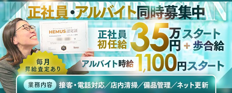 ■対面接客・受付業務 お客様からのお問合せや来店されたお客様の案内を行っていただきます。 予約の確認や、会計作業、注意事項の喚起などをお願いします。 簡単なマニュアルや、先輩スタッフに付いて業務内容を見ながら徐々に覚えていただきますので、未経験の方でも安心して働けます。 ■PC更新業務 ヘブンネットなど、ポータルサイト等の店舗情報更新作業を行っていただきます。 キャストの出勤情報やイベント、求人ブログの作成となります。 基本的にはボタンを押すだけや、ブログの更新時に簡単に文字が入力出来れば問題ありません。 PCが苦手な人でも簡単にできます。 ■清掃・備品管理 お客様やキャストの方に快適にお過ごしいただくため、店内の清掃や備品の管理・補充を行っていただきます。 |