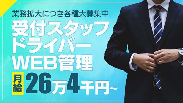 ■電話受付業務(お客様との対面接客はありません) お客様からの電話のお問合せ対応を行っていただきます。 予約の受付や空き状況の確認・説明をお願いします。 予約の確定後はキャストやドライバーに通達します。 簡単なマニュアルや先輩スタッフに気軽に聞ける環境ですので、未経験でも安心して働けます。 ■企画の立案 店舗イベントや店舗運営など様々な企画を提案していただきます。 【新規のお客様の増加】【お客様のリピート率の向上】【キャストの方の入店数の増加】など、売上UPに繋がる施策の提案を行っていただきます。 ■キャスト管理 お店で働いていただいているキャストの方が稼げるようにインターネットを使ったPR(写メ日記)などの使い方などのアドバイスを行っていただきます。 ■PC更新業務 ヘブンネットなど、ポータルサイト等の店舗情報更新作業を行っていただきます。 キャストの出勤情報やイベント、求人ブログの作成となります。 基本的にはボタンを押すだけや、ブログの更新時に簡単に文字が入力出来れば問題ありません。 PCが苦手な人でも簡単にできます。 ■清掃・備品管理 お客様やキャストの方に快適にお過ごしいただくため、店内の清掃や備品の管理・補充を行っていただきます。 |