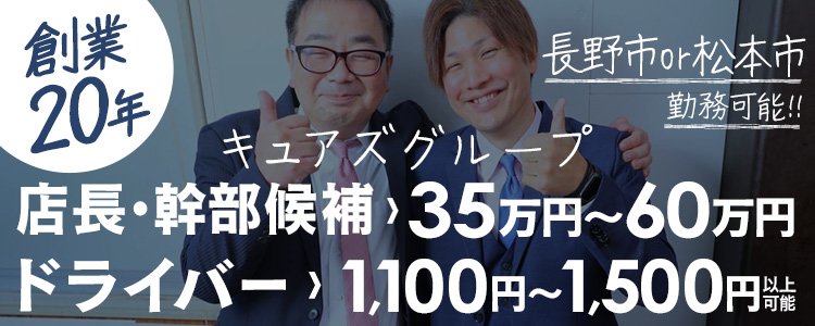 ************************** ◆◆外注ドライバー 3名急募!!◆◆ 1,100円~1,500円以上も可能♪ ◆◆正社員 2名募集!!◆◆ 30万円~ + 賞与 そして、キャリアアップ制度により 【主任】 → 【幹部候補】→【店長職】→【ゼネラルマネージャー(GM)以上】へと昇進&昇給!! ◆◆主任・幹部候補◆◆ 35万円~ + 賞与 ◆◆店長職◆◆ 40万円~ + 賞与 ◆◆ゼネラルマネージャー以上◆◆ 60万円~ + 賞与 キュアズグループは『男性』も『女性』も活躍中!! 安心して働ける職場です! ************************** 【◆当店キュアズグループのポイント◆】 *長野県下最大級グループ♪ *健全経営♪ *業界未経験者 大歓迎♪ *自分の可能性を試してみたい方 大歓迎♪ *社会保険完備♪ *誠実で情熱で溢れた職場・スタッフ♪ *チャレンジできる環境♪ 【◆送迎ドライバーのポイント◆】 *空いた時間に働けます♪ *送迎業務はコンビニ等のアルバイトとは違い、誰にも知られずにはたけます♪ *【自分の車を持込の方】も【お店の車をレンタル】のどちらでもOK♪ *業界最高水準の環境♪ 【◆一般社員、店長・幹部候補のポイント◆】 *キュアズグループは、男性も女性も活躍中♪ *業界経験は問いません♪ *能力(スキル)・誠実さ・情熱で、昇進&昇給♪ *誠実で信頼できるスタッフがいるチームで成長できます♪ ★★★★★★★★★★★★ お仕事をしていく上で【働く環境】はとても大切です!! ◆在籍の女の子さん同様に、スタッフの顔ぶれも変わらないのが【デリヘルヘブン松本店】 ◆人間関係・信頼関係がベースにあり、【職場・仕事が楽しい・・・】って最高だと思いませんか!? ◆そんな私たちの仲間になってくれる男女をお待ちしています(^^) 誠心誠意、真面目に働いてくれる【あなた】と先ずはお会いしたい!! 気軽にお問い合わせくださいね(^^) ◆キュアズグループ 誕生20年以上♪ お客様に愛され、そして一度、お店を辞めてもまた戻ってきてくれるキャストが多いお店であること・・・いつも大変嬉しく思っています 「繋がり・ご縁」を大切にしているお店で、あなたも働いてみませんか!? |