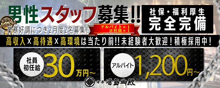 是非このチャンスをモノにして下さい! 当店は地域密着型店舗として運営しており お客様からのご好評を頂いており 昨今のウイルス禍の状況でも 安定した業績を誇っております! そして今回、業績アップにつき なんとスタッフ『2名』を募集致します! 当店は業界では非常に珍しい 『社会保険、各種福利厚生』を完備! ★月給30万START★ 皆様からのご応募お待ちしております! アルバイト、パートでのご応募も大歓迎です!! そして当店は『学歴』や『経験』は一切不問です! 求めるのはただ一つ 『真面目に働ける』これだけです!! 一緒にビジネスとして 真摯に「ソープランド運営」に取り組み 新しいステージへ 一緒に上り詰めていけたらと思います! まずはお気軽にご応募下さい! |