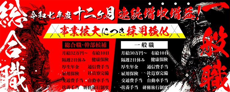 ■他業種からの応募急増中! ■未経験大歓迎 ■35歳以下大歓迎(長期キャリア形成を図るため) 時にユーモアに包まれ、時に熱気溢れる会社で 貴方の得意分野を存分に活かして働きませんか? 『社員全員が、役員』 ■業界によくある、腐敗した年功序列は完全撤廃。 入社から最短半年で店長、次に1年半で副店長へとスピード出世した 若手が多く集まる会社だからこそ、自ずと道を切り開き 風俗というジャンルを新しいエンターテイメントとして確立していきたい所存です。 「物心両面豊かになりたい」 そんな活気のある貴方のご応募、お待ちしております。 オススメポイント ○社員寮完備(独り立ちまでサポートいたします。遠方からでもご安心下さい) ○交通費全額支給 ○最短4ヵ月で店長になれる‼(前例あり) ○有給休暇(年10回~) ○社員研修旅行制度あり(国内・国外にて実施) ○縦割り廃止でパワハラ、セクハラ一切なし。女性も安心して働けます。 |