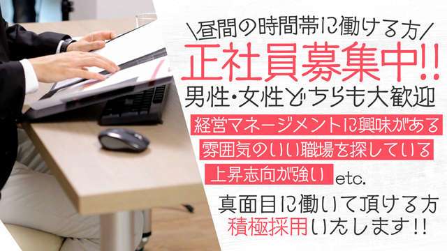 ■電話受付業務(お客様との対面接客はありません) お客様からの電話のお問合せ対応を行っていただきます。 予約の受付や空き状況の確認・説明をお願いします。 予約の確定後はキャストやドライバーに通達します。 簡単なマニュアルや先輩スタッフに気軽に聞ける環境ですので、未経験でも安心して働けます。 ■PC更新業務 ヘブンネットなど、ポータルサイト等の店舗情報更新作業を行っていただきます。 キャストの出勤情報やイベント、求人ブログの作成となります。 基本的にはボタンを押すだけや、ブログの更新時に簡単に文字が入力出来れば問題ありません。 PCが苦手な人でも簡単にできます。 ■清掃・備品管理 お客様やキャストの方に快適にお過ごしいただくため、店内の清掃や備品の管理・補充を行っていただきます。 |