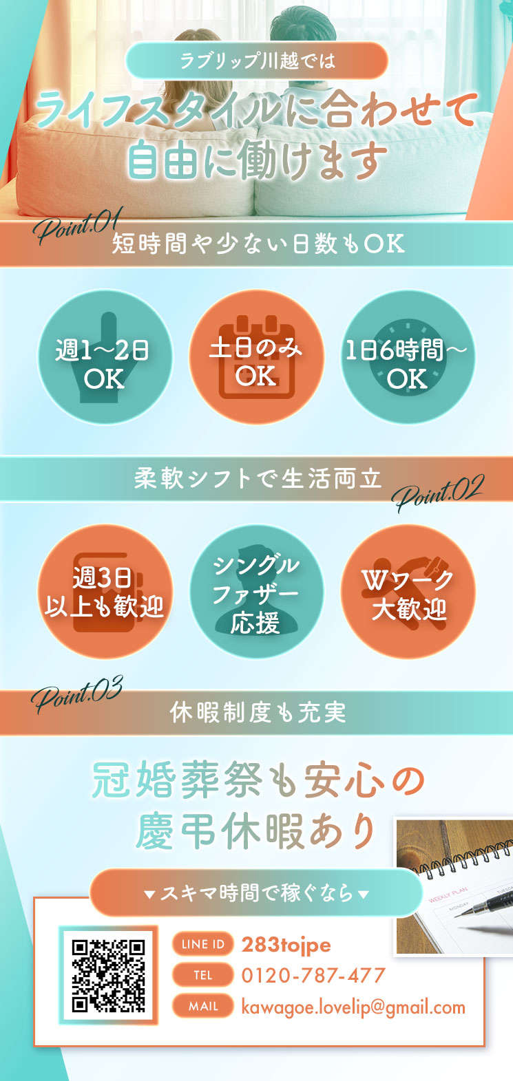 完全自由出勤の為お好きなお時間でシフトを組んでいただけます。