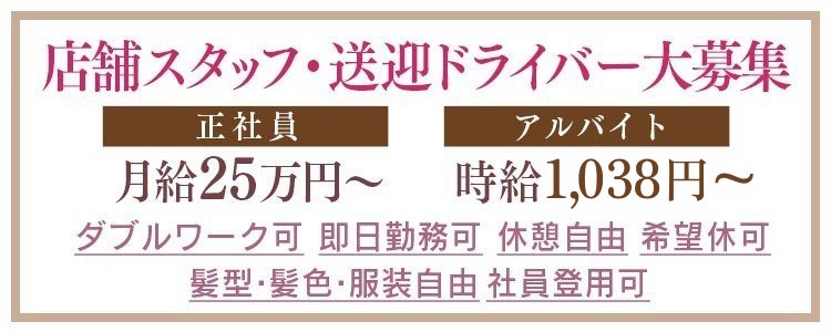 自動車免許(ATのみOK!!) ■学歴不問 ■未経験者歓迎 ■職種経験者歓迎 ■ブランクOK ■キャスト経験者も歓迎 |