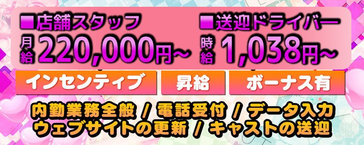 ■電話対応 お客様との対面はありません。電話のお問い合わせ対応をしていただきます。予約の受付や空き状況の確認・説明をお願い致します。予約確定後は、ドライバーさんやキャストさんに通達します。 ■ネット関係の編集・更新 ヘブンネットなど、他媒体の店舗情報更新を行って頂きます。キャストの出勤情報やイベント、求人ブログの作成となります。基本的には簡単な操作も多いため、PC作業が苦手な方でも簡単に覚えることができます。 ■事務所・待機場・寮の清掃 キャストの方に快適にお過ごしいただくため、待機場や寮の清掃や備品の管理・補充を行なっていただきます。また、事務所内の雑務や清掃も行います。 ■企画の提案 イベントや運営に関して、様々な提案をしていただきます。【新規のお客様の増加】【リピート率の向上】【キャストの方の入店数の増加】など、売り上げUPに繋がる施策の提案を行なっていただきます。 ■キャスト管理 お店で働いていただいているキャストの方が稼げるように、写メ日記のやり方や、写真の撮り方などアドバイスしたり、相談にのったり、キャストの皆様が安全に楽しく働ける環境を作っていくこと。 ■送迎 |