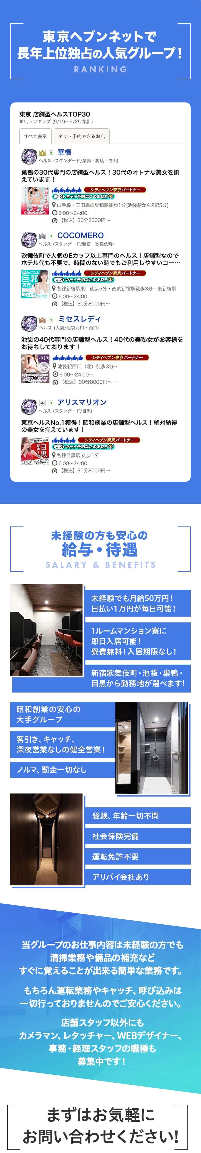 未経験でも月給50万円!ワンルーム寮費無料即入居可能!日払い1万円可能!巣鴨、池袋、新宿、目黒で選べる勤務地! 運転業務もございません!未経験でこの業界に入られる方は色々と不安もあるかと思いますが当グループは、公安委員会が定める風営法の届出済店舗ですので店舗型営業を行えております。 健全な運営を行っており呼び込みや時間外営業などもありませんのでご安心下さい。 店舗スタッフ、ウェブデザイナー、カメラマン、フォトレタッチャー、事務スタッフの職種を募集中です! 未経験者も安心して働けるのでぜひ一度お気軽に面接にお越しください。【スタッフ募集専用サイト】https://alicegrp.co.jp/