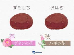 ぼたもちは「ぼたん」の咲く春のお彼岸の時期に食べるもの、おはぎは「はぎ」の季節である秋のお彼岸に食べるものといったように、時期によって呼び方が変わります。