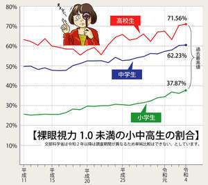 たとえば文部科学省や眼科医会のデータでは学生の約7〜8割が裸眼視力1.0未満という報告があります。