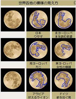 そんな月は、小さいころから「ウサギが餅つきをしている」と育てられた方も多いのでは?「月」イコール「ウサギの餅つき」というのは、日本では当然のような結びつき。ですが、世界共通ではないようです。各国では次に記す一覧のように見られています。