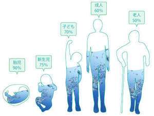 私たちの体の中でもっとも多いのは水分で、成人男性の場合、全体の約60%を占めています。