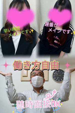 ■対面接客・受付業務 お客様からのお問合せや来店されたお客様の案内を行っていただきます。 予約の確認や、会計作業、注意事項の喚起などをお願いします。 簡単なマニュアルや、先輩スタッフに付いて業務内容を見ながら徐々に覚えていただきますので、未経験の方でも安心して働けます。 ■企画の立案 店舗イベントや店舗運営など様々な企画を提案していただきます。 【新規のお客様の増加】【お客様のリピート率の向上】【キャストの方の入店数の増加】など、売上UPに繋がる施策の提案を行っていただきます。 ■キャスト管理 お店で働いていただいているキャストの方が稼げるようにインターネットを使ったPR(写メ日記)などの使い方などのアドバイスを行っていただきます。 ■PC更新業務 ヘブンネットなど、ポータルサイト等の店舗情報更新作業を行っていただきます。 キャストの出勤情報やイベント、求人ブログの作成となります。 基本的にはボタンを押すだけや、ブログの更新時に簡単に文字が入力出来れば問題ありません。 PCが苦手な人でも簡単にできます。 ■清掃・備品管理 お客様やキャストの方に快適にお過ごしいただくため、店内の清掃や備品の管理・補充を行っていただきます。 ・女の子の面接 ・女の子の出勤管理 誰でも出来る簡単なお仕事です☆ |