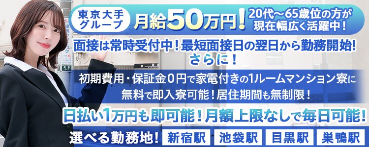 未経験でも月給50万円!初日から日払い1万円可能です!ワンルーム個室寮無料で即入居可能です!新宿、池袋、目黒、巣鴨から勤務地選べます!年齢不問のやる気重視で採用!面接は常時受付中です!最短、面接日の翌日から勤務開始&入寮可能です!