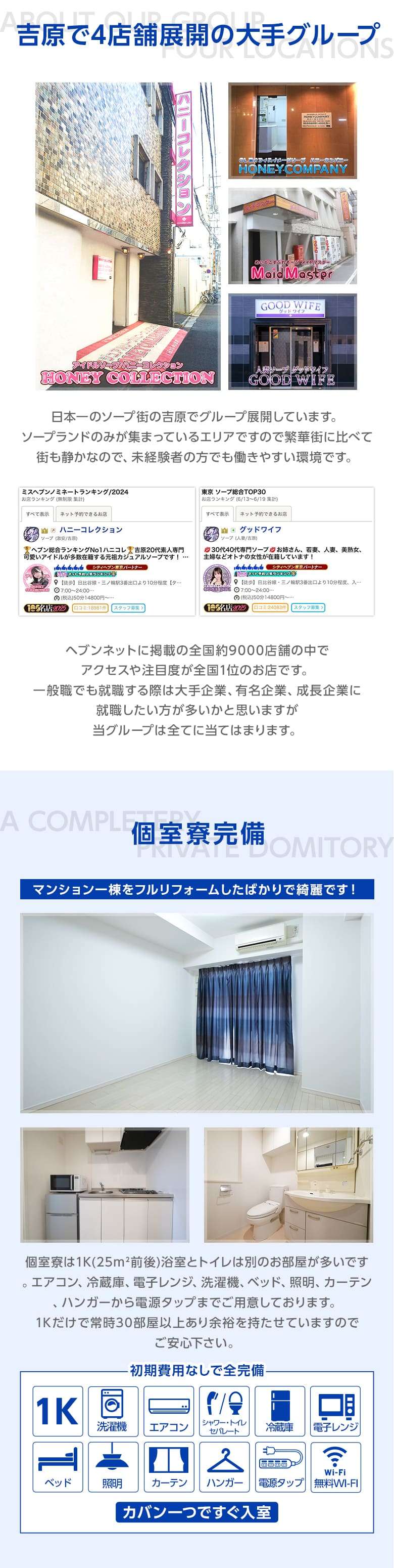 月給52万5千円!1Rマンション寮無料!日払い1万円、年齢不問!業界経験問わず大歓迎です!全店舗に喫煙ルーム完備でタバコ休憩有り!吉原エリアで4ブランドのソープを運営する人気グループです。頑張れば2.3年で年収1000万稼げる会社です!店舗スタッフ、ウェブディレクター、ウェブデザイナー、カメラマン、フォトレタッチャー、女性講習員の職種を募集中です!仕事に対して真面目に取り組んで頂ける方であれば年齢、経験など関係なく採用しますのでお気軽にご応募ください。【公式URL】https://honeygrp.co.jp/
