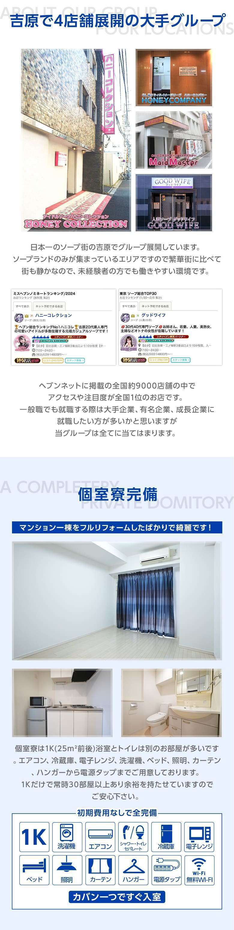東京の吉原でソープランド、ハニーコレクション、ハニーカンパニー、メイドマスター、グッドワイフを運営するグループです。