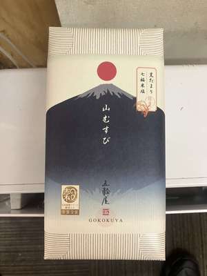 富士山に日の丸が描かれたパッケージの「五穀屋・山むすび」。