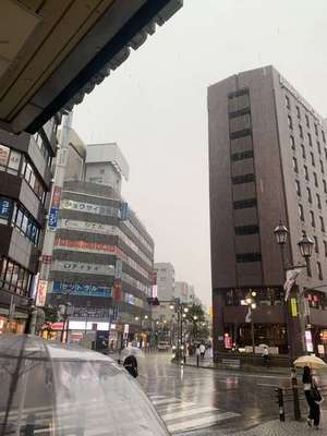 傘を差していても足元や服が濡れてしまうほどの強い雨。