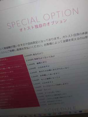 特別っていいですよね♪そんなフジです。オトストにはスペシャルオプションというものがあります。こちらは、女性がそれぞれ料金設定からキャッチコピーまで考えているオプションになります。通常のオプションはコース料金とあわせてクレジットカード決済やpaypay決済可能ですが、スペシャルオプションは現金でお願いしています。女性とイチャイチャしながら決めて頂ければと思います(^^)