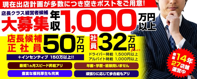 「経験者」大歓迎 業界で店長実績のある方、自ら数字を作った実績のある方 現在、在職中でポストに空きが無く昇進を待たざるを得ない方 ご自身の力で店舗を運営したいと考えている方 経験者の方は特に優遇いたします。 「未経験者」大歓迎 未経験の方でも向上心とやる気のある方、誰にでも出来る簡単なWEBサイトの更新や受付業務などから始めていただきます。 あなたの頑張りと結果に応じて随時「昇給」「昇格」いたします。 チャンスを掴みたいと考えている異業種の方大歓迎です。 ※18歳以上(高校生不可) ※暴力団関係者及びそれに準ずる方のご応募は、固くお断りさせていただいております。 |