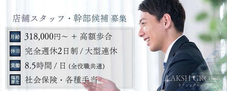【待遇・福利厚生】 ・健康保険 ・厚生年金 ・雇用保険 ・労災保険 ・社内表彰制度 ・研修制度 ・資格取得支援制度 ・健康診断 ・通勤手当 ・住宅手当 ・扶養手当(家族手当) ・慶弔見舞金(結婚祝金、出産祝金、弔慰金、傷病見舞金) ・社員慰労会会費補助 ※社会保険の加入は任意 【ラクシュグループの強み】 当社は、様々な事業を展開する総合ベンチャー企業です。 現在は、ナイトレジャー(風俗)を基幹事業として規模拡大を図っています。 「人材が全て」という考えのもと、今までのナイトレジャー業界では成し得なかった報酬・待遇・働き方をご用意しています。 一般事業も展開しているからこその福利厚生と経営体力が、ご家族がいらっしゃる方でも生涯安定して働くことができる所以です。 また、各々の目標達成ができるようにビジネスフィールドが構築されていますので、共に切磋琢磨し、価値ある仕事に打ち込める仲間と出会えることを心より願っています。 |