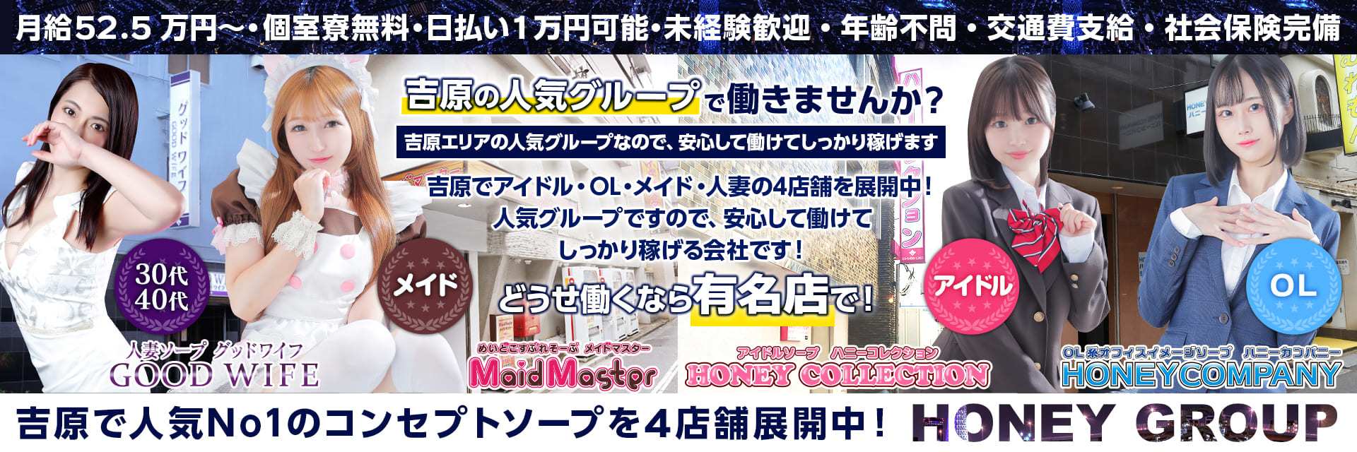 東京の吉原でソープランド、ハニーコレクション、ハニーカンパニー、メイドマスター、グッドワイフを運営するグループです。
