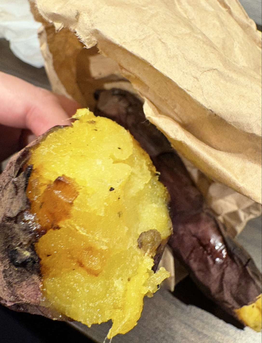 焼き芋を片手に持っている。