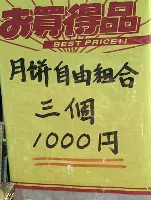 月餅自由組合、ここで見るまで聞いたこともありませんでした。多分?月餅3個組み合わせ自由で1000円と言いたいのでしょうが、日本人には、困惑と笑いを提供してくれました。