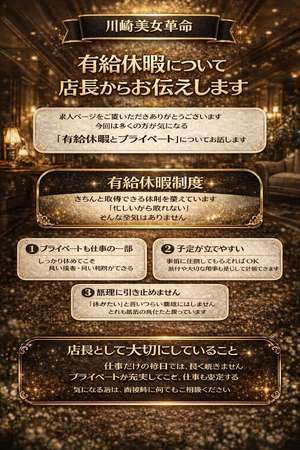 店長ブログ 次のページへ≫ 入社初日から 日払い可能になります! 2026/01/29 11:00 川崎美女革命 日払い制度について 求人ページをご覧いただきありがとうございます 今回は応募時によく聞かれる 「日払い制度」についてご説明します 入社初日から 日払い5,000円可能 「最初の給料日まで不安」 そんな心配をしなくて大丈夫です 働いた分を、きちんとその日に受け取れます 初日から対応 研修期間だから出ない、ということはありません スタート時の不安を減らすための制度です 無理に使わせません 日払いはあくまで選択制 毎月の安定収入を大切にしたい方も歓迎しています 生活面もサポート 急な出費や環境の変化にも対応できるよう 働き始めの負担を軽くすることを大切にしています 店長としてお伝えしたいこと お金の不安は、仕事の集中力を下げてしまいます まずは安心して働けること それを一番に考えた制度です 安心してスタートできる環境 入社初日から、しっかりサポートします 気になる点は、面接時に遠慮なく聞いてください お店に直接メールで質問する お問合せは 「ジョブヘブン見た」で! 記事URL| 求人情報を見る| お店サイトを見る 有給休暇でプライベートも充実! 2026/01/28 11:00 川崎美女革命 有給休暇について 店長からお伝えします 求人ページをご覧いただきありがとうございます 今回は多くの方が気になる 「有給休暇とプライベート」についてお話しします 有給休暇制度 きちんと取得できる体制を整えています 「忙しいから取れない」 そんな空気はありません プライベートも仕事の一部 しっかり休めてこそ 良い接客・良い判断ができると考えています 予定が立てやすい 事前に相談してもらえればOK 旅行や大切な用事も安心して計画できます 無理に引き止めません 「休みたい」と言いづらい環境にはしません それも店長の責任だと思っています 店長として大切にしていること 仕事だけの毎日では、長く続きません プライベートが充実してこそ、仕事も安定する そう本気で考えています 休めるから、頑張れる 無理なく、長く 自分のペースで働ける環境です 気になる点は、面接時に何でもご相談ください お店に直接メールで質問する お問合せは 「ジョブヘブン見た」で! 記事URL| 求人情報を見る| お店サイトを見る 働き方改革!無駄な残業一切ございません! 2026/01/27 11:00 川崎美女革命 働き方改革について 店長からお伝えします 求人ページをご覧いただきありがとうございます 今回は多くの方が気になる 「働く時間」についてお話しします 実働8時間勤務 早番・遅番の2交代制 無理な残業はありません 働く時間を守ることも、店の責任だと考えています ダラダラ働かせません 長時間=頑張っている、ではありません 限られた時間で結果を出す働き方を大切にしています オン・オフの切り替え 仕事が終わったら、しっかり休む プライベートも充実してこそ、良い仕事ができると考えています 管理職こそ時間管理 無理なシフト・無理な残業をさせない 働きやすい環境を整えるのも、店長の役目です お店に直接メールで質問する お問合せは 「ジョブヘブン見た」で! 記事URL| 求人情報を見る| お店サイトを見る 次のページへ≫ プロフィール ニックネーム:KAWANO お客様とキャスト様への敬意を大切にすることが、すべての基本です。業界は未経験からのスタートですが、「今日よりも明日」その意識を持って、真剣に仕事に向き合える方と一緒に成長していきたいと考えています お店データ ◇店名 川崎美女革命 ◇業種 ソープ ◇勤務エリア 川崎駅・堀之内・南町 求人情報を見る サイトを見る 求人ムービーを見る 最新のブログ一覧 入社初日から 日払い可能になります! 有給休暇でプライベートも充実! 働き方改革!無駄な残業一切ございません! 即日入寮可能。上質な住環境で始める大人の新生活。 高収入!挑戦を求める人へ! カレンダー << 1月 >> 日 月 火 水 木 金 土 1 2 3 4 5 6 7 8 9 10 11 12 13 14 15 16 17 18 19 20 21 22 23 24 25 26 27 28 29 30 31 アーカイブ 2026年01月 ( 8 ) 関連の求人 社会保険完備/ 残業なし/ 学歴不問/ 経験者歓迎/ 即日採用合否通達可/ 川崎駅・堀之内・南町/ 髪型自由/ 入社祝い金支給/ 寮・社宅あり/ 月給30万円以上 SNS応募方法 川崎美女革命様のSNSID katachi9610 24時間いつでもご連絡下さい! SNSサービスから上のIDにお問い合わせください。「ジョブヘブンを見ました」とお伝えすると対応がスムーズになります。 お電話・メールから応募する場合 電 話 044-246-7818 メール kawasaki.bijokakumei@gmail.com 採用担当: KAWANO 受付時間: 7:00~24:00 閉じる