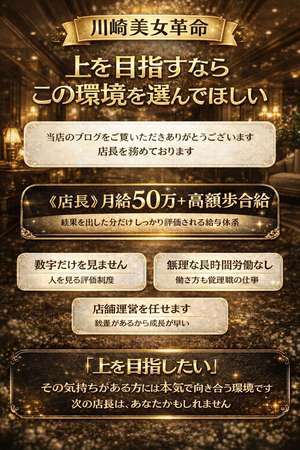 店長ブログ ≪前のページ 記事一覧 次のページ≫ 高収入!挑戦を求める人へ! 2026/01/25 11:00 《店長》 月給50万+高額歩合給 自分の頑張り次第で 即昇進可能 正直に言います。 このポジション、楽ではありません。 でも、 年齢で判断されるのが嫌な人。 頑張っても評価されない環境に違和感がある人。 ここでは年功序列はありません。 見ているのは、結果と姿勢だけ。 指示待ちではなく、 自分で考えて動ける人。 責任を背負える人。 そういう人には、年齢や経歴に関係なく チャンスも裁量も任せます。 簡単な仕事ではありません。 逃げ道も多くはない。 でもその分、本気で上を目指せる環境です。 「次は、もっと上を狙いたい」 そう思ったなら、一度話しましょう。 最後までご覧いただき、ありがとうございます。 お店に直接メールで質問する お問合せは 「ジョブヘブン見た」で! 求人情報を見る| お店サイトを見る ≪前のページ 記事一覧 次のページ≫ プロフィール ニックネーム:KAWANO お客様とキャスト様への敬意を大切にすることが、すべての基本です。業界は未経験からのスタートですが、「今日よりも明日」その意識を持って、真剣に仕事に向き合える方と一緒に成長していきたいと考えています お店データ ◇店名 川崎美女革命 ◇業種 ソープ ◇勤務エリア 川崎駅・堀之内・南町 求人情報を見る サイトを見る 求人ムービーを見る 最新のブログ一覧 入社初日から 日払い可能になります! 有給休暇でプライベートも充実! 働き方改革!無駄な残業一切ございません! 即日入寮可能。上質な住環境で始める大人の新生活。 高収入!挑戦を求める人へ! カレンダー << 1月 >> 日 月 火 水 木 金 土 1 2 3 4 5 6 7 8 9 10 11 12 13 14 15 16 17 18 19 20 21 22 23 24 25 26 27 28 29 30 31 アーカイブ 2026年01月 ( 8 ) 関連の求人 日払い可/ 即日採用合否通達可/ 残業なし/ 研修あり/ 未経験可/ 社会保険完備/ WEB面接OK/ 正社員/ 車・バイク通勤可/ 交通費支給 SNS応募方法 川崎美女革命様のSNSID katachi9610 24時間いつでもご連絡下さい! SNSサービスから上のIDにお問い合わせください。「ジョブヘブンを見ました」とお伝えすると対応がスムーズになります。 お電話・メールから応募する場合 電 話 044-246-7818 メール kawasaki.bijokakumei@gmail.com 採用担当: KAWANO 受付時間: 7:00~24:00 閉じる