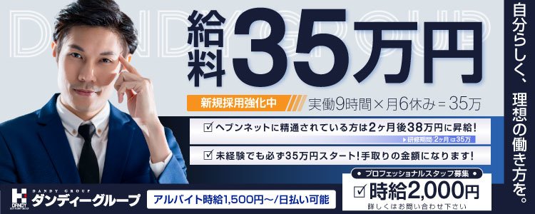 ダンディーグループでは、一緒に頑張る仲間を募集しております! お給料は必ず初月から35万円スタート!未経験でも大歓迎です♪ ※ヘブンネットに精通している方は、2か月後に38万円に昇給!! 同時に女性店舗スタッフの募集もしております。 元キャストの方の方も大歓迎です! 『あの時こんな声をかけて欲しかった』 『このような対応があれば嬉しかった』など、 当時の経験を活かして、今度は店舗スタッフとして 活躍してみませんか? -100%復帰採用- 出戻りの従業員も必ず採用致します! 即戦力を求めております! 最初から女性スタッフ管理や営業管理業務に携わってもらいます! 当グループの仕事を知ってる方を待ってます!! ※前役職での復帰をお約束します! 【プロフェッショナルなスタッフも募集】 年齢対象 25歳~40歳まで 時給2,000円 8時間勤務 週2日休 長期勤務出来る方で ★応募資格★ 風俗店長、役職経験者、指名上位ホスト 水商売マネージャー以上経験者、他業種で営業経験者など ※パソコンスキルのある方 ※要普通自動車免許証 お給料改革! 売上に応じて2000円~5000円の「大入り手当」支給! 毎日でもお渡しいたします!! 「手取り35万円スタート」にくわえ 大入り最大で「15万/月」で研修期間が終わり次第40万オーバーも可能♪ ※希望により社会保険も加入可能です 即入寮で入社後すぐに安定した生活ができます! お気軽にご相談ください。 創業22年の実績により女の子やお客様の認知度はバツグン! 大変ありがたい事に女の子のご応募も多数いただき、ほぼ毎日面接を実施しております。 そして現在、当グループでは全従業員が働きやすいように随時改善・改革を実施中! 細かいところでは給与支給日なども働く人の生活環境改善を考え変更致しました。 もちろん何でもかんでも「従業員に都合よく」という訳ではありませんが 無駄やムラを省き、改善の余地があるところは改善し、合理化を行うことで 環境改善に成功しております。 また生活にお困りの方、不安がある方には日払いも大丈夫です。 何でもご相談下さい。 ■残業や休日出勤について■ 一時的に人手が不足した際などは残業をお願いする場合もありますが 残業代等の手当は別途支給しております。 ※もちろん強制的に残業や休日出勤をお願いすることはありませんのでご安心ください。 |