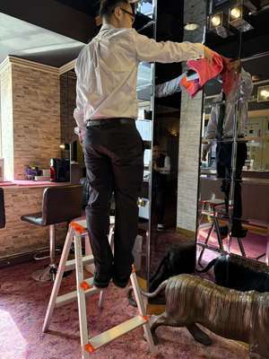 笑顔で元気に挨拶を交わし、店舗内の清掃を行います。清潔な環境でお客様をお迎えするため、スタッフ全員で協力しています。