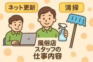 ネット更新と清掃業務を、ご紹介します。 お店のホームページや出勤情報、写真などを更新。 また来たいと思えるようなキレイな空間づくりが大切。 「最初は不安でしたが、マニュアルがあって丁寧に教えてもらえるので安心でした」