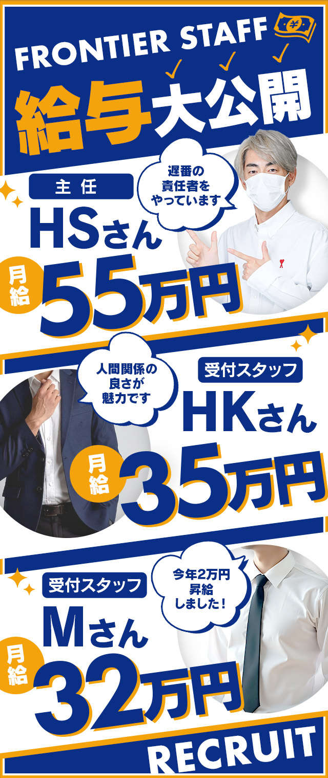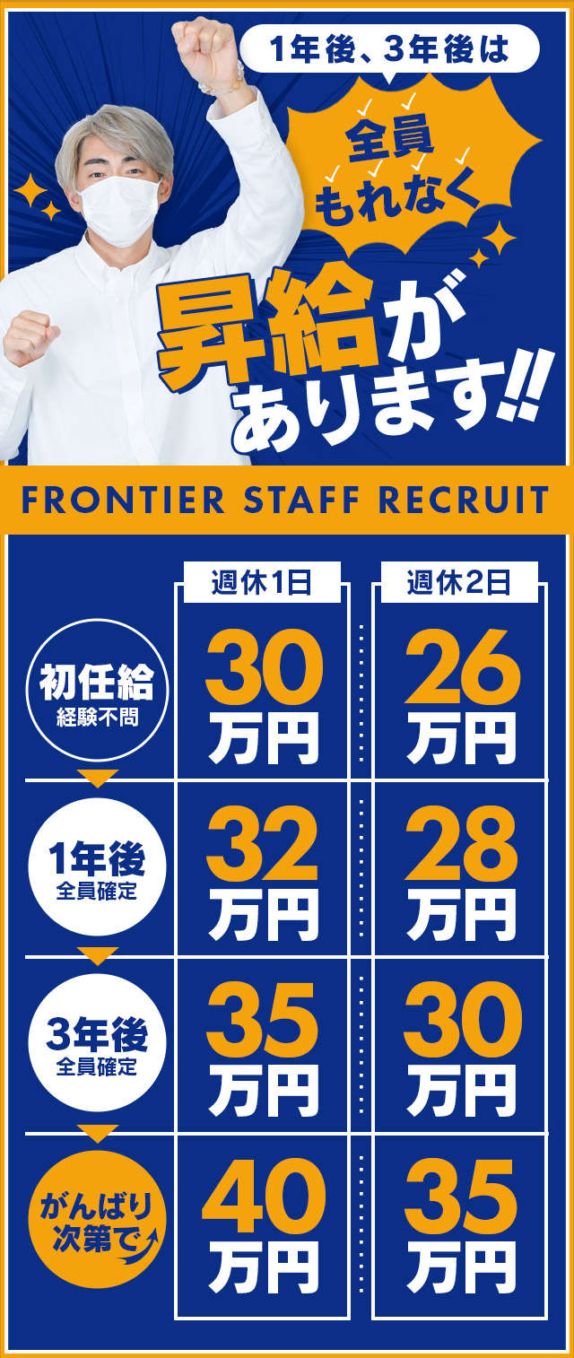 どうも!FRONTIERのハナ専こと「Mochi#φωφ」です!僕は業界未経験かつ風俗店利用経験なしのまま入社しました。知識がないまま始めた仕事ですが、大吉さんを初め色々な方に教えてもらいながら日々仕事をしています。成長できてるといいなぁFRONTIERでは僕みたいな未経験でも問題なく働ける指導環境があるので、同じように「未経験だから心配…」って人でも安心です。勉強することは多いですが…必要なのはやる気だけ!でもガチガチっていう訳でもないので、働きやすい環境が整っていると思います。普段どんなことやってんの?っていうのはブログに投稿してるのでぜひご覧ください(🌸・△・)