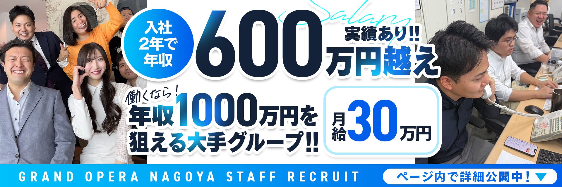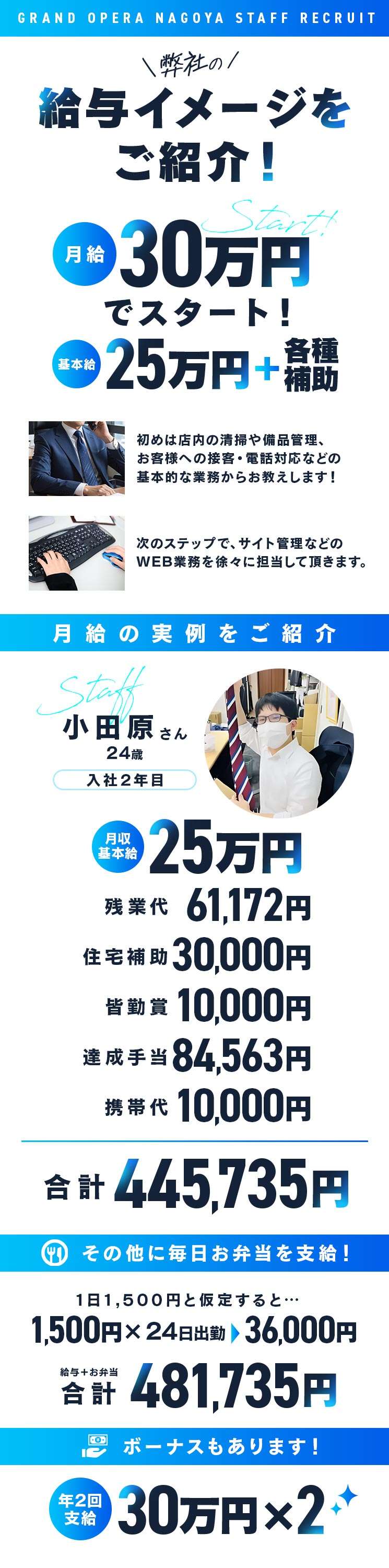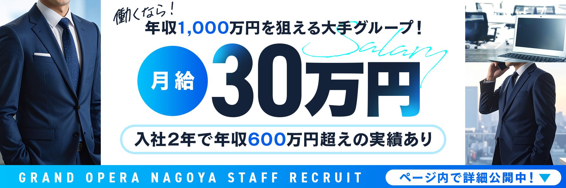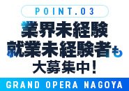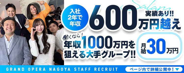 「Grand Opera」には新入社員教育制度があり、入社研修後一から学べるので心配いりません。最初から完璧な人はいません。逆にピュアなあなたの発想が会社の発展に大切なのです。名古屋東京横浜福岡にグランドオペラ出店しており、現在グランドオペラ大阪の準備中!!グランドオペラ大阪の店長候補、スタッフもあわせて募集しております。やる気のある貴方の力を必要としております。一緒に頑張り全国展開する我々と一緒に全国NO1の店舗と全国NO1の給料を一緒に手にするために頑張ろう!!