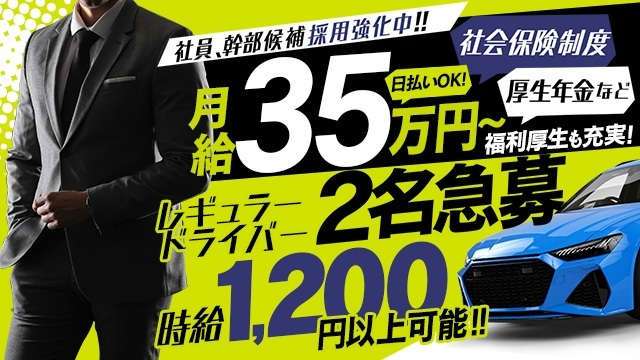 ▼POINT① 社会保険加入可(他社さんでは中々ないのではないでしょうか?) ▼POINT② 完全個室寮あり(1K/あと2部屋)※2026/3/1現在 家電家具も揃っています。即入寮可! ▼POINT③ 全額日払いOK(*^^)v ▼POINT④ ドライバー時給1,200円以上※能力次第で上がります ▼POINT⑤ 独立支援制度有。あなたのお店を持つことができます!収入&夢は無限大! ▼POINT⑥ パソコン操作全般のスキルアップが見込める! 今の時代はかなりデジタル化されてますからね、昔の風俗店とは違い ネットでの予約受付であったり、配車であったり、 ほぼパソコンで作業することが多いです。 色々なソフト、アプリを使って頑張ってます! |