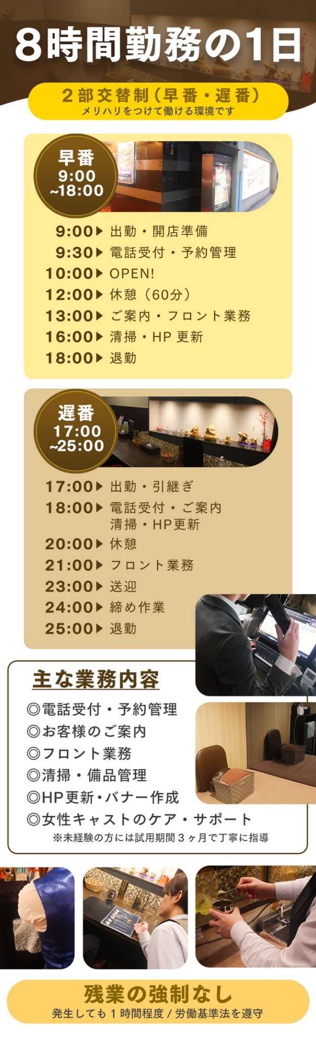 電話番・受付・ご案内・フロント業務・撮影段取り・送迎・掃除・裏方・HPの更新・バナー・看板の更新&作成・シフト回収・写メ日記の書き方・接客の仕方・女性のケア etc.