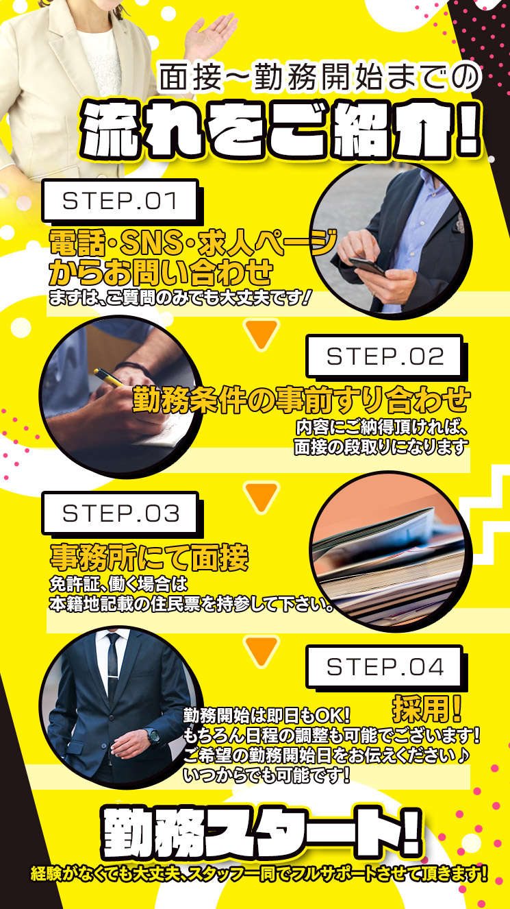 待遇:日払い可能 昇格随時有り(面接時応相談)/前借り制度有り