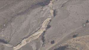ダムの底のひび割れた地面がむき出しとなっている状態。